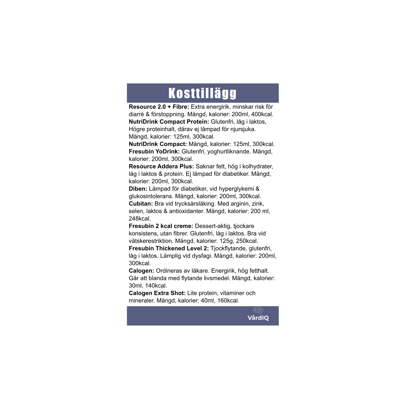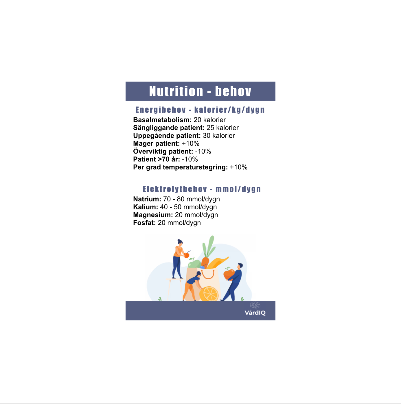 På ena sidan av denna lathund har du en tabell som visar energibehovet hos enskilda patienter, då även inkluderat olika procenttillägg beroende på deras situation (exempelvis om de har feber, om de är undernärda/överviktiga osv). På samma sida finns även elektrolytbehov per dygn för vuxna. På baksidan av denna lathund finns en lista av majoriteten av näringsdrycker/kosttillägg som patienter kan tänkas erbjudas. Där finns information om vad de innehåller eller när de är lämpade/ej lämpade samt mängd och kalorier.