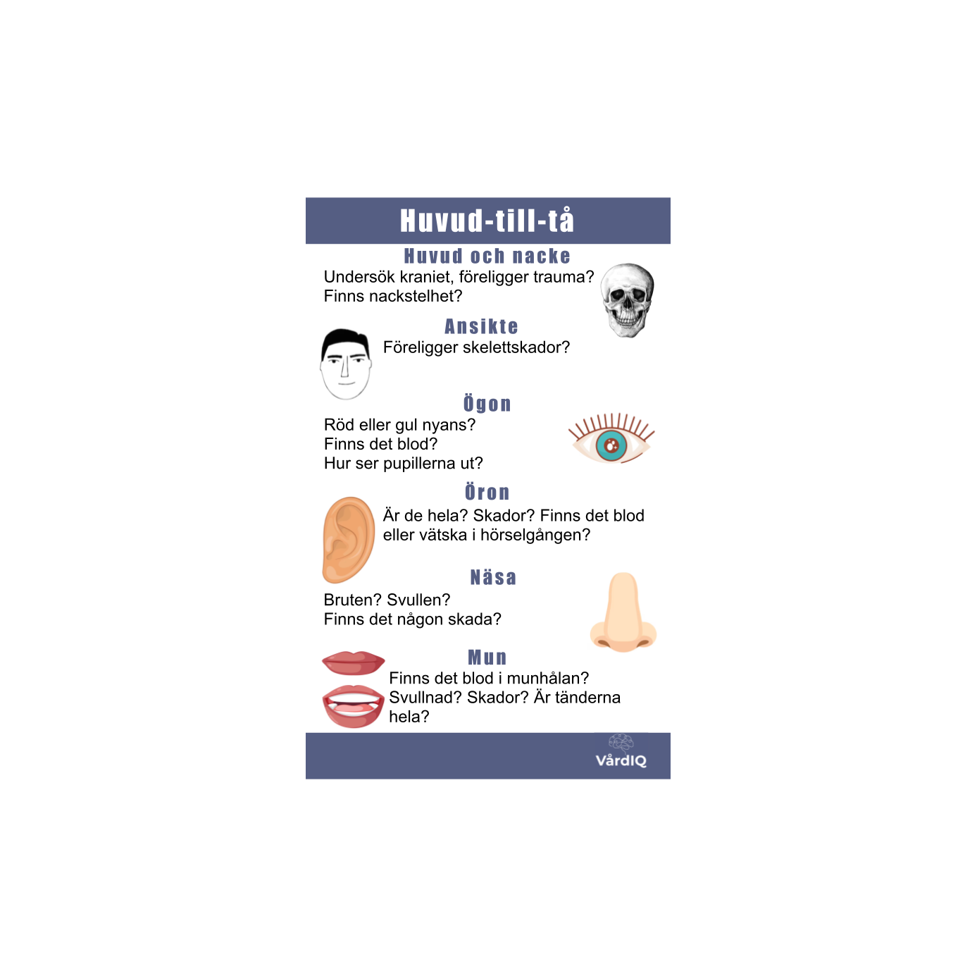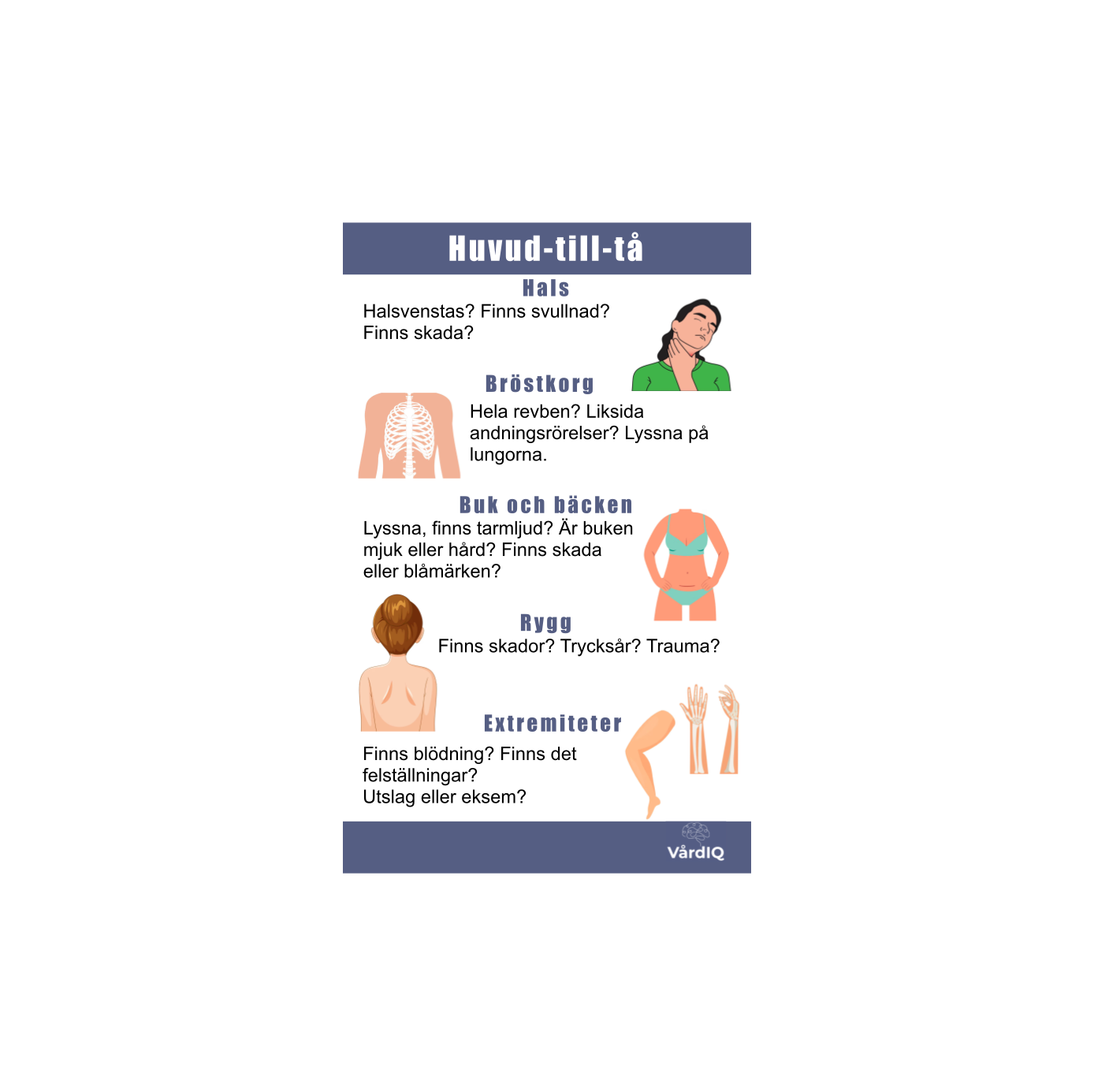 En lathund som smidigt passar i din ficka för att du lätt ska ha koll på vad du kan titta efter när du gör din huvud-till-tå bedömning.