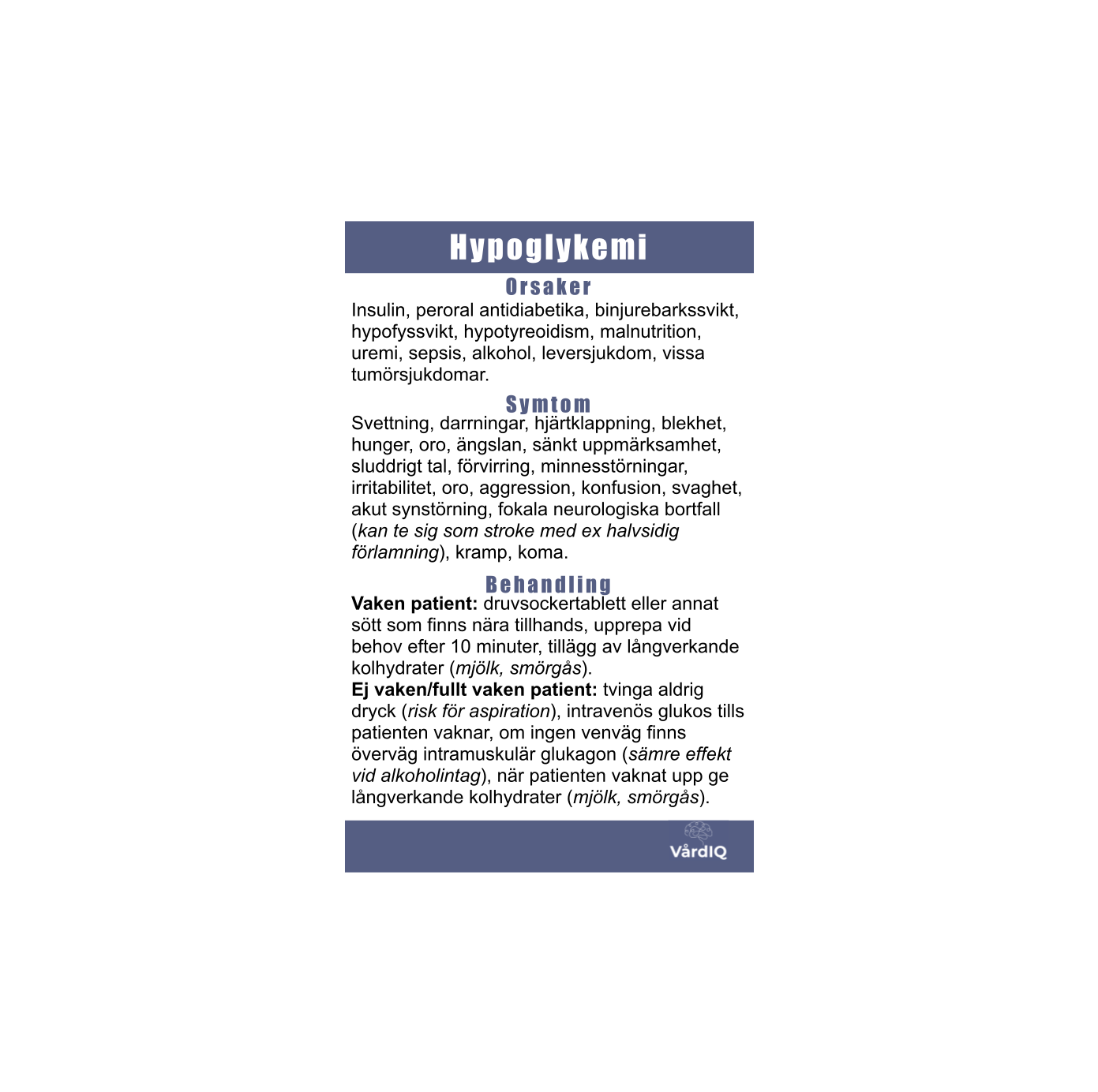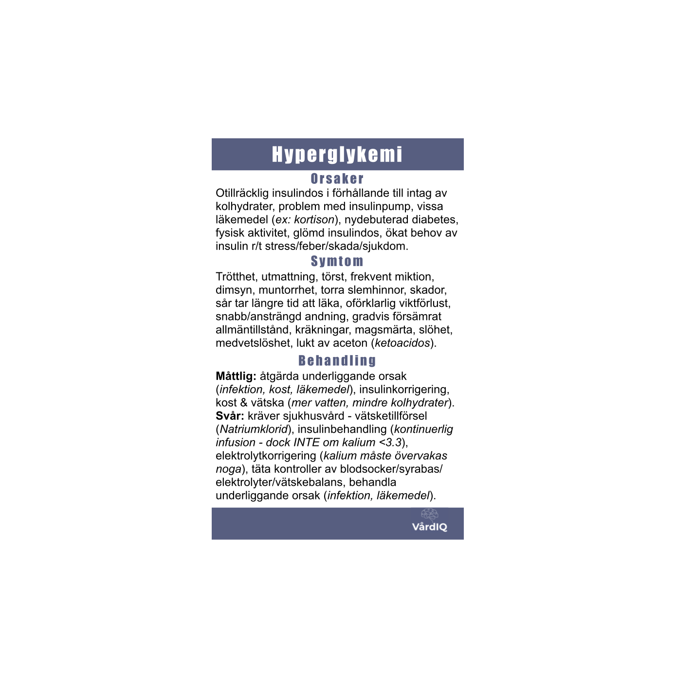 Denna lathund innehåller information kring orsak, symtom och behandling vid hyper- respektive hypoglykemi.